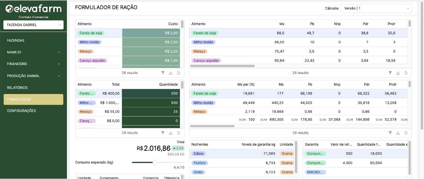 A ElevaFarm não apenas ajuda na gestão atual da sua fazenda, mas também promove práticas sustentáveis que garantem o crescimento a longo prazo. Com nosso formulador de ração, você pode otimizar a alimentação dos animais, reduzir custos e minimizar impactos ambientais, contribuindo para uma produção mais sustentável e lucrativa.