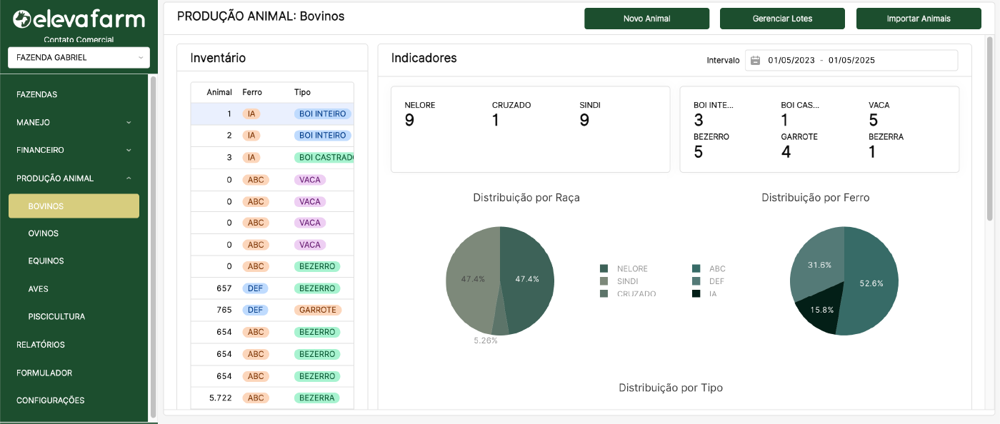 ElevaFarm é uma solução completa e integrada para a gestão de fazendas voltadas à produção animal. Nossa plataforma oferece uma versão web para administração e um aplicativo móvel para operações em campo, proporcionando um controle total de todos os aspectos da gestão agropecuária, desde o manejo de animais até o controle financeiro e tomadas de decisões inteligentes.
